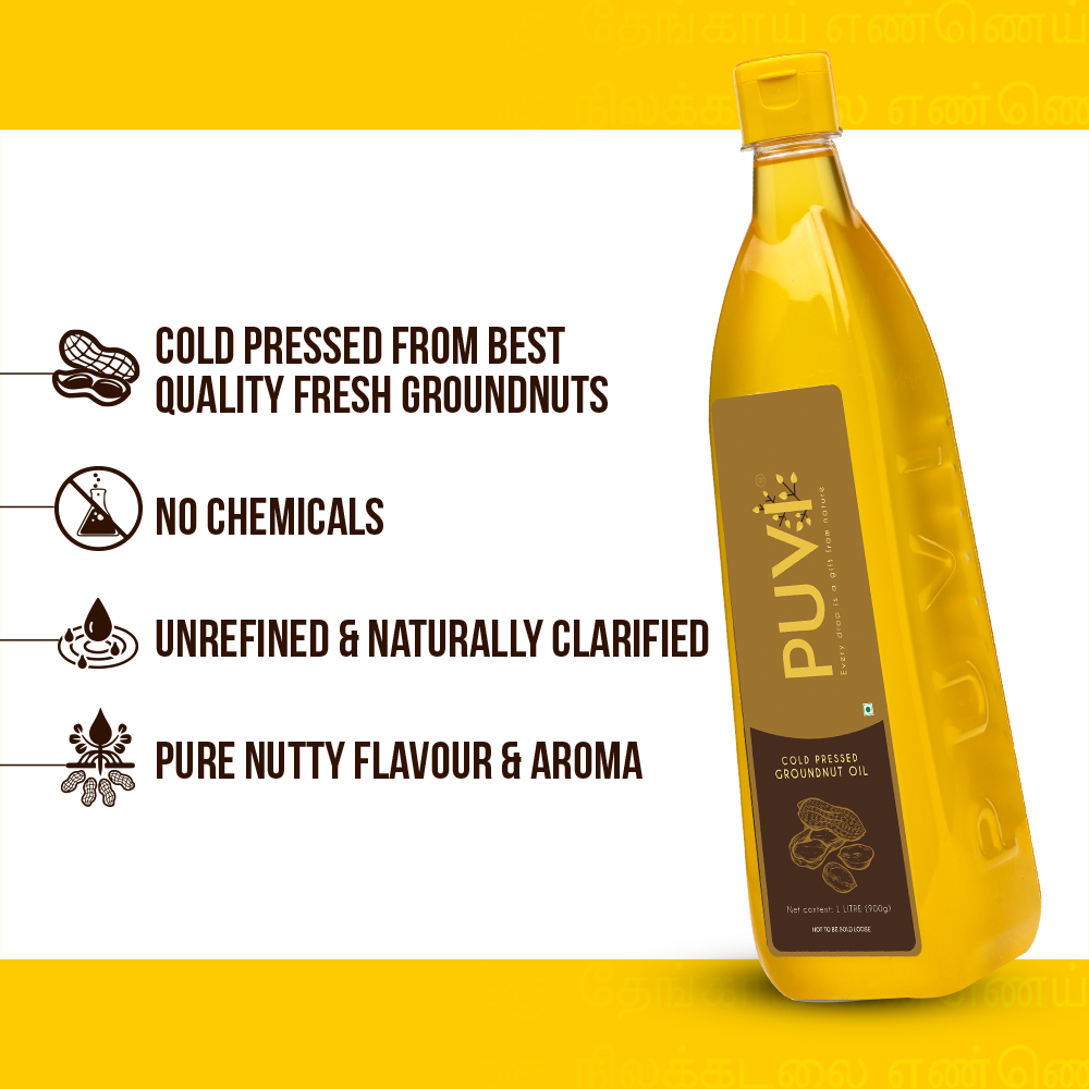 Cold pressed from superior quality full-grained Groundnuts, Puvi Cold Pressed Groundnut Oil is the best replacement as your everyday cooking oil. It preserves the natural qualities of the seeds and adds to the natural flavour and aroma to your dishes.